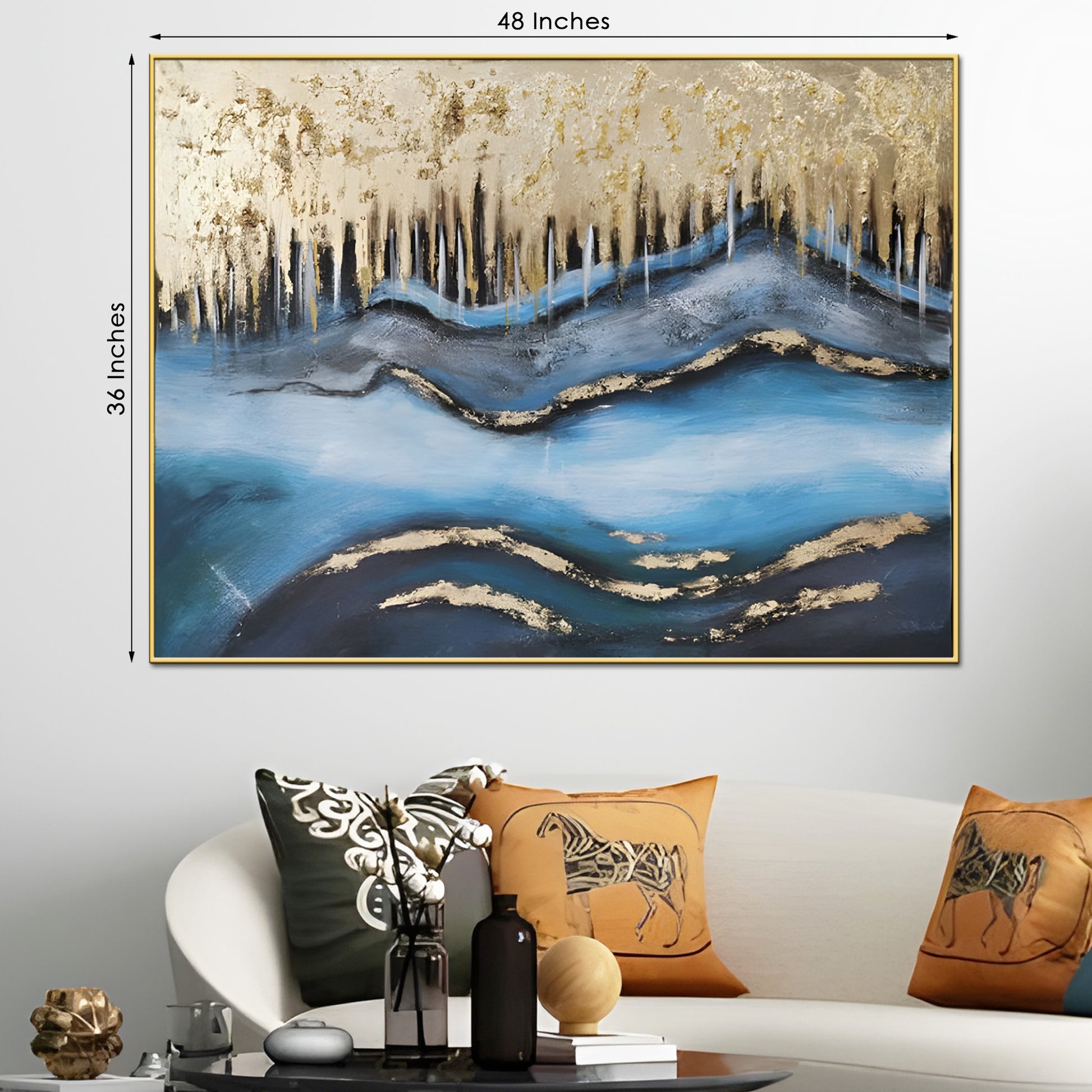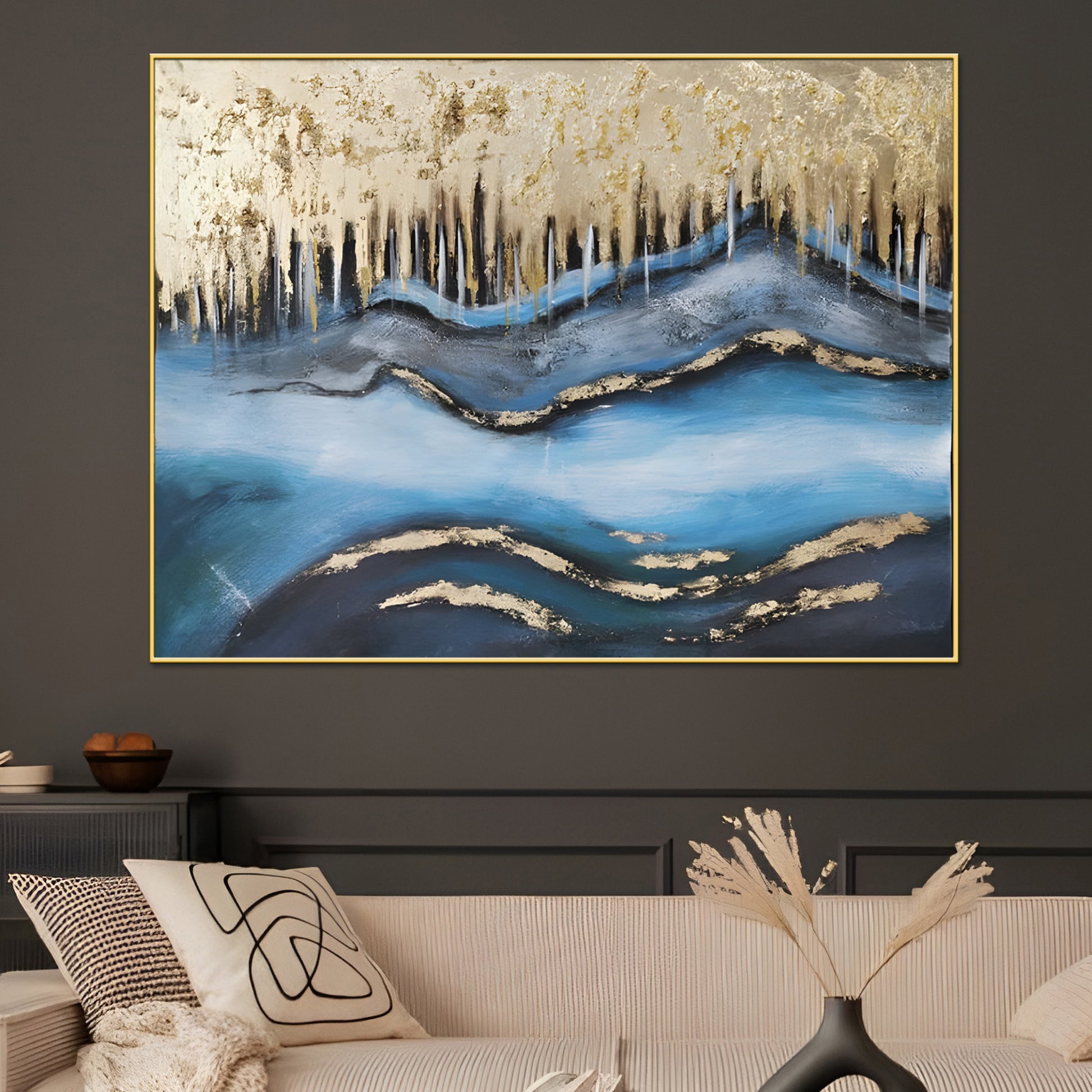 Immerse yourself in the mesmerizing depths of Momentum of the Ocean Abstract, a stunning hand-painted artwork that captures the vast beauty and fluid motion of the sea. Swirling shades of deep navy, tranquil sky blue, and shimmering gold accents evoke the power and serenity of ocean waves in motion. With delicate golden birds soaring amidst the tide, this painting brings a sense of freedom, tranquility, and boundless energy to any space.