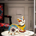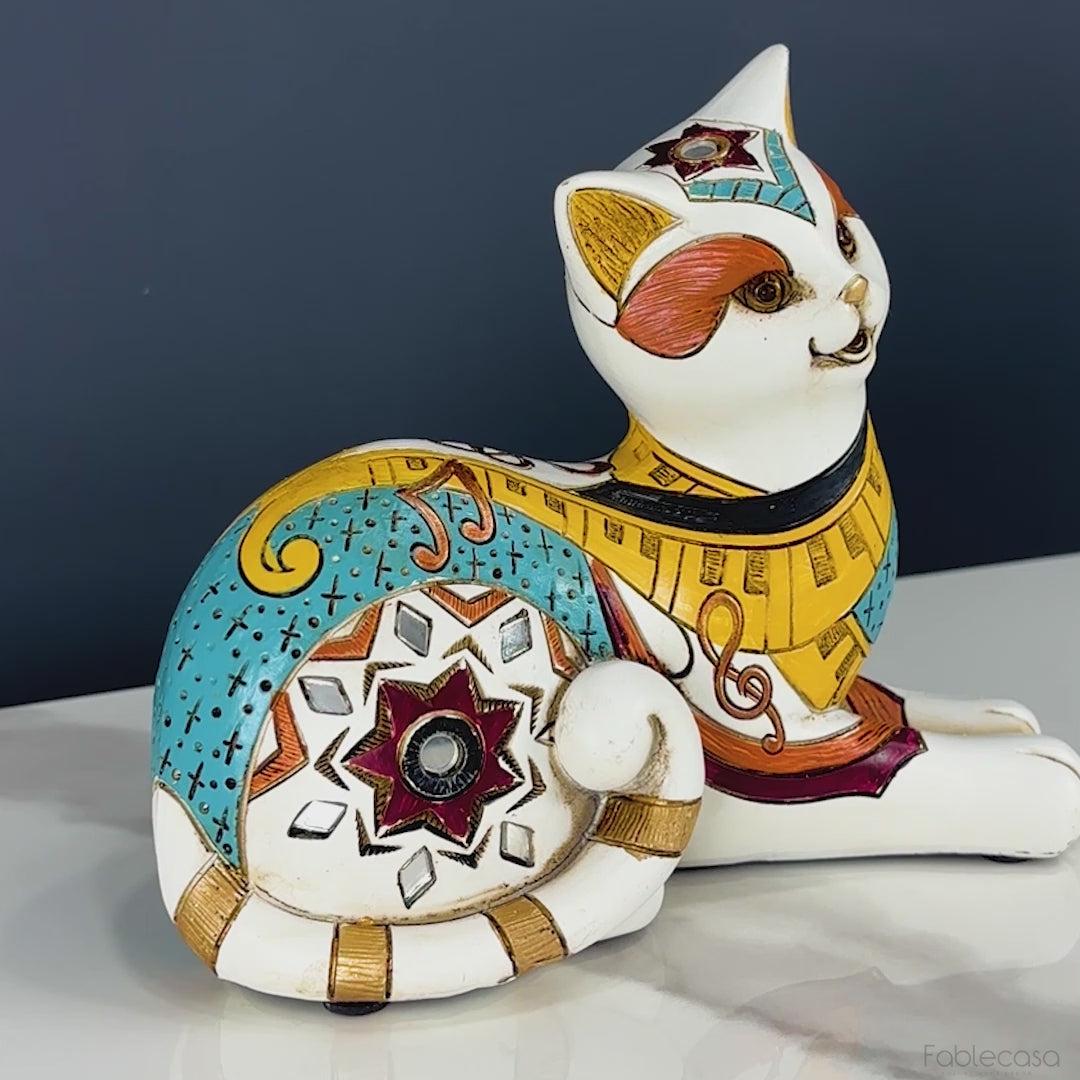 The 'Egyptian White Queen' tabletop sculpture is an artistic representation of a stylized feline, designed as a decorative showpiece for interior spaces. While the imagery presented is that of a cat, the title suggests a possible symbolic connection to Egyptian royalty or deities, often associated with feline forms. The sculpture blends the form of a domestic cat with intricate, colorful patterns that appear to draw inspiration from a mix of artistic traditions. The cat's pose is relaxed and inviting, with a slightly tilted head and a gentle expression. The use of vibrant colors and detailed patterns creates a visually engaging and unique decorative element. This sculpture aims to bring a touch of artistic interpretation and possible cultural fusion to any tabletop or display, making it suitable for living rooms, studies, or as a conversation starter in a decorative collection.