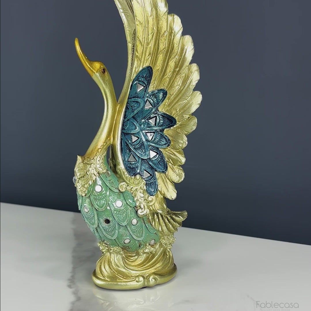 Elevate your home decor with the 'Aurum Swan' tabletop sculpture, a piece that embodies elegance and opulence. This beautifully crafted statue features a swan with outstretched wings, adorned with a luxurious combination of gold and jewel-toned accents. The intricate details of the feathers and the vibrant colors create a captivating visual, making it a stunning focal point for any room. The swan's graceful form and the rich, metallic finish add a touch of regal charm to your living space.