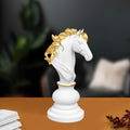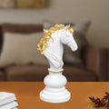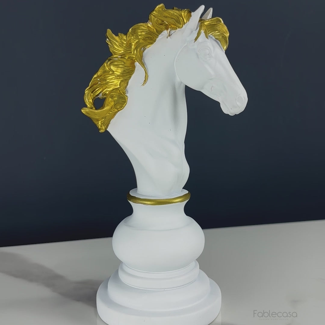The 'Knight's Reign' decorative sculpture presents a stylized horse head, inspired by the knight chess piece, designed as a tabletop showpiece for interior spaces. This piece blends the classic form of the knight with modern artistic elements, featuring a smooth, white finish that contrasts with the metallic gold accents on the horse's mane and base. The sculpture's design suggests a fusion of strategic game elements with contemporary art, creating a unique and eye-catching decorative piece. The horse's head is rendered with clean lines and a minimalist aesthetic, emphasizing its form and elegance. This showpiece aims to bring a touch of intellectual sophistication and artistic flair to any tabletop or display, making it suitable for living rooms, studies, or as a conversation starter in a personal collection.