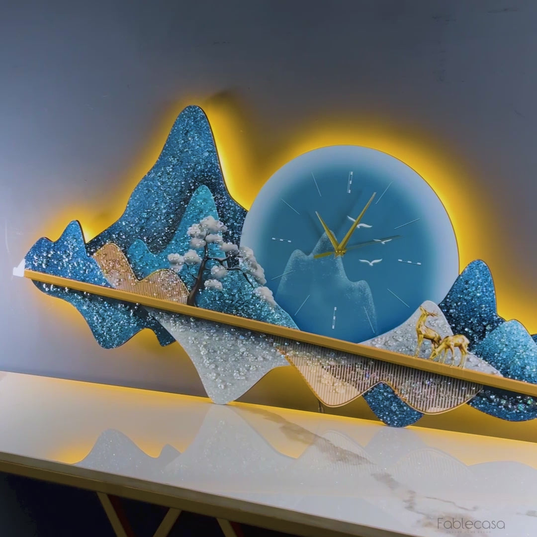 Transform your walls into a breathtaking escape with the Land of Paradise Crystal Glass Backlit LED Painting with Clock where art, ambiance, and timekeeping meet in perfect harmony. This exquisite piece features a serene mountain landscape crafted on premium crystal glass, delicately illuminated by warm LED backlighting. A central timepiece is seamlessly embedded within a glowing full moon, blending form and function into a work of modern decor. Each contour and element from snow-kissed trees to golden deer evokes a peaceful world that feels both timeless and alive.