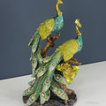 This decorative showpiece features two stylized peacocks perched on a decorative branch, designed as a focal point for interior spaces. This sculpture captures the majestic essence of peacocks, known for their vibrant plumage and regal bearing. The birds are rendered with detailed textures and a blend of metallic gold and jewel-toned green and blue finishes, enhancing their ornate appearance. The composition of the two peacocks, positioned side-by-side, suggests a sense of companionship or a harmonious pair. The decorative branch, adorned with stylized floral elements, adds a touch of natural elegance to the piece. This sculpture aims to bring a touch of opulence and natural beauty to any interior setting, making it suitable for display in living rooms, dining areas, or as a statement piece in a decorative collection.
