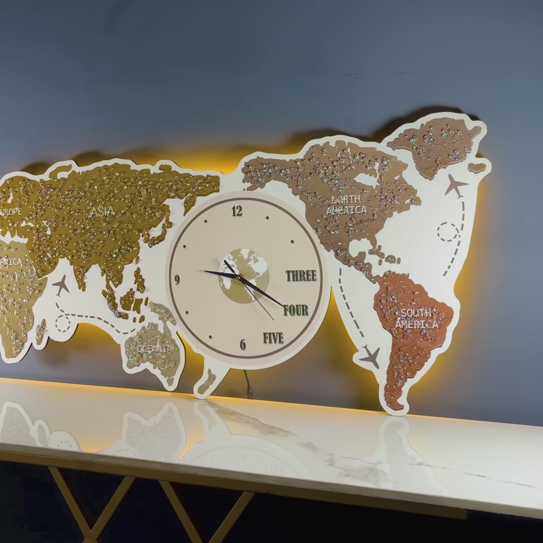 Bring the world to your walls with the Map of The Earth Crystal Glass Backlit LED Painting with Clock (Land Edition) a bold blend of global inspiration and modern functionality. This stunning wall decor features a full world map meticulously crafted on high-grade crystal glass, enhanced with a soft ambient LED backlight that adds both warmth and sophistication to your space. A central, oversized clock is cleverly embedded within the map, making this piece a striking fusion of art and utility.