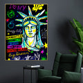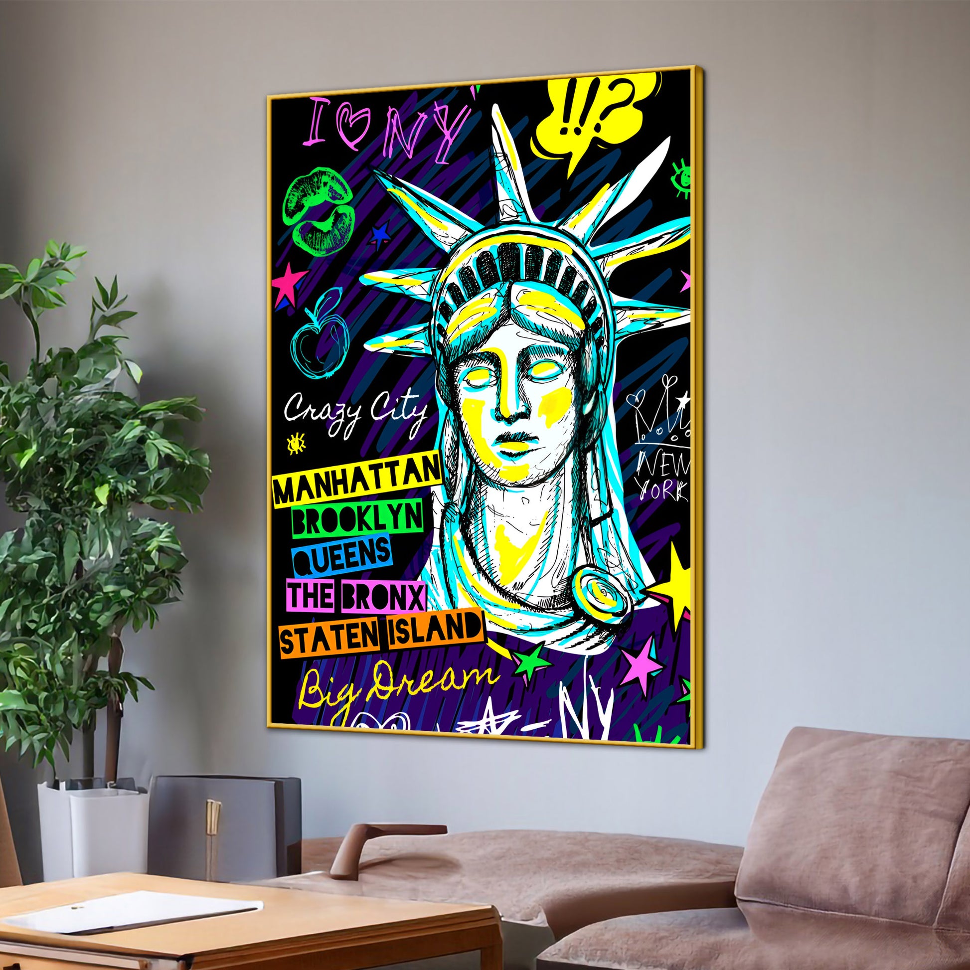 The Statue of Liberty is reimagined as a 'Graffiti Goddess' with neon hues and urban art elements. The NYC boroughs and 'Big Dream' text add a contemporary narrative. It's a chic piece for modern interiors, celebrating New York City pride.