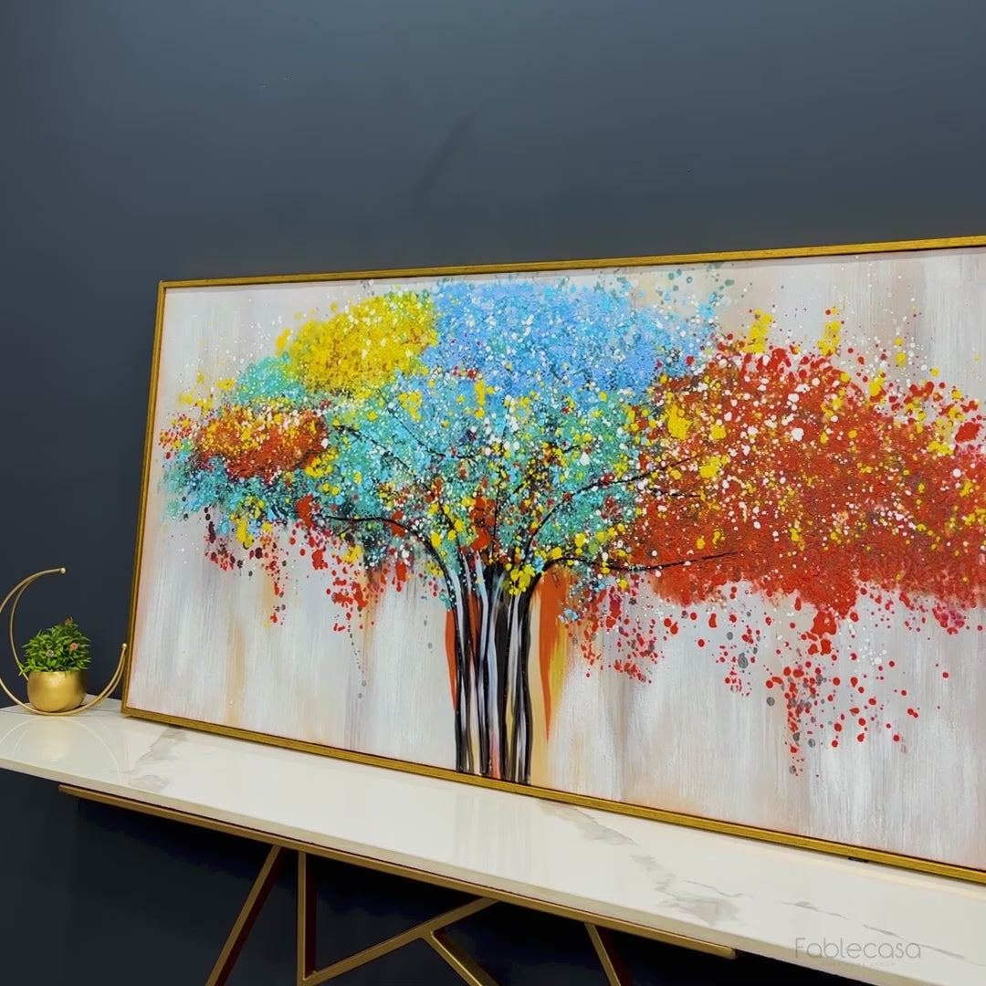 The Tree of Life in Seven Colors is a breathtaking hand-painted masterpiece designed to add a touch of sophistication and charm to your interiors. Featuring an explosion of vivid colors red, blue, yellow, and more this artwork symbolizes harmony, growth, and the beauty of nature. The textured brush strokes and meticulous detailing create a mesmerizing effect, making it a perfect statement piece for your living room, bedroom, or office.