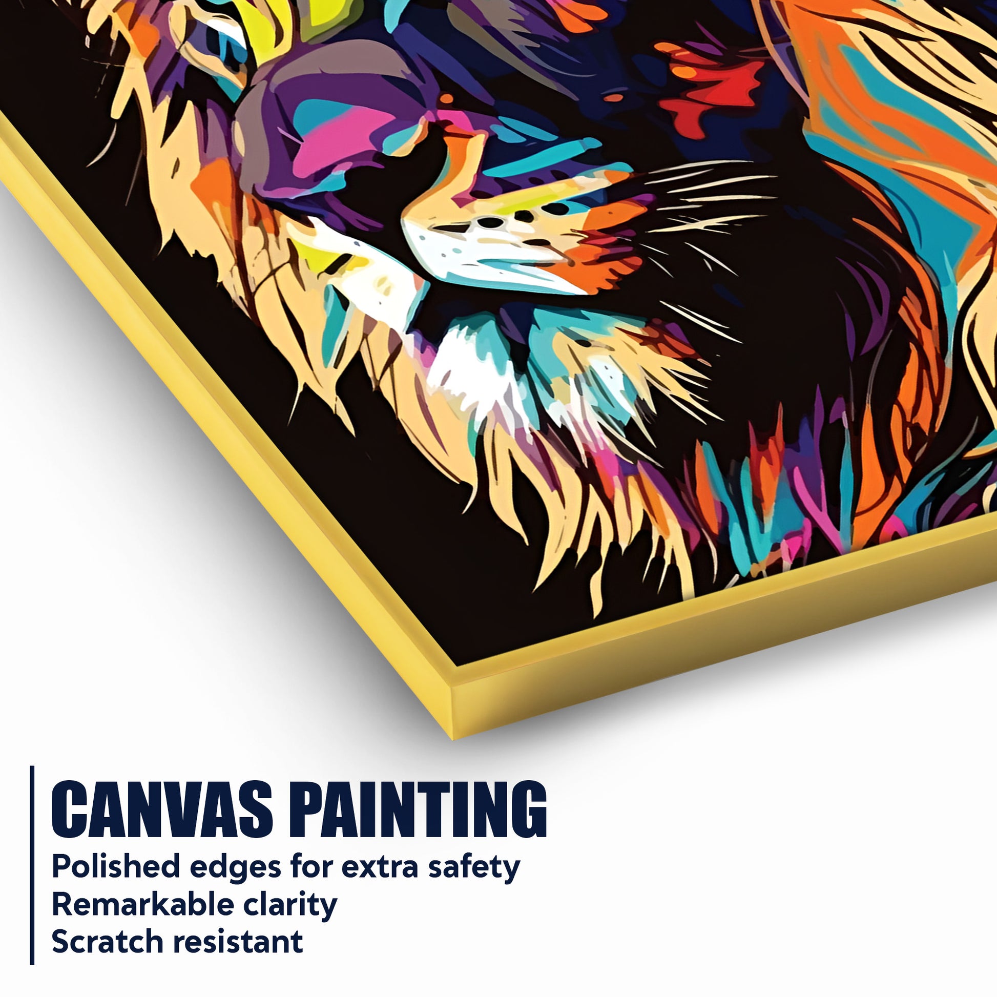 A stylized lion is rendered in vibrant, abstract colors, accompanied by 'YOU ARE THE KING' text. The artwork blends wildlife art with motivational messaging. The contrasting colors and sharp lines add a modern aesthetic to contemporary spaces.